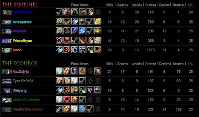 It's an old game played last year, and it was brought to my attention when I was reading a gg.net thread about "most creepkills", and the above screenshot was shown, along with the original thread. Medusa with 1273 creep kills says it all about this game, about the amount of post-mega creep that they had to endure. The game started pretty balanced, but although both sides were equally farmed, the sentinel was outpushed with the scourge heroes constantly targeting towers and raxes which resulted in mega creep within 50 minutes. But the real action started after that - for the next 40 minutes, scourge decided to farm neutrals, hanging around the map without real effort to attack the Tree, and eventually failed to end the game due to medusa and drow's resolute defending. Then the scourge decided to change their approach, by getting Euls and try to end the game while Medusa/Drow/others were in mid air! But the plan failed, needless to say.